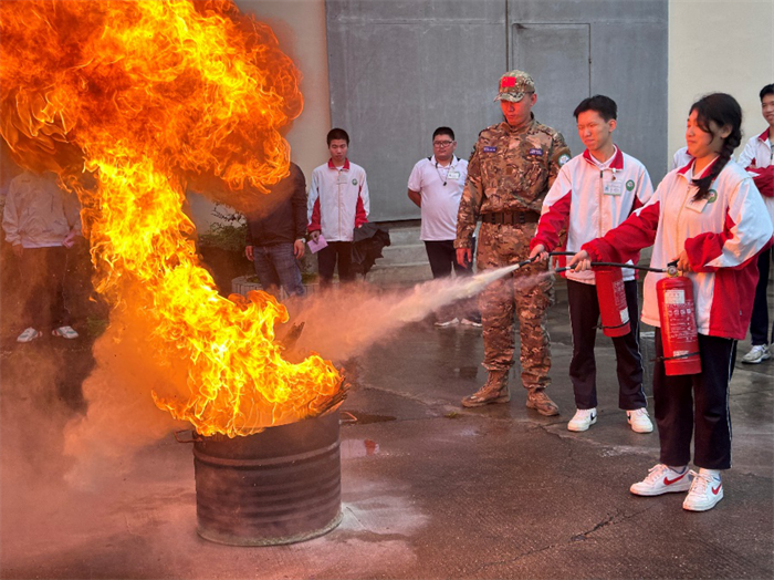 会后,保卫处带领全体安全员参加消防灭火演练。向同学们详细阐述了干粉灭火器的使用方法和注意事项并带领同学们实地演练。