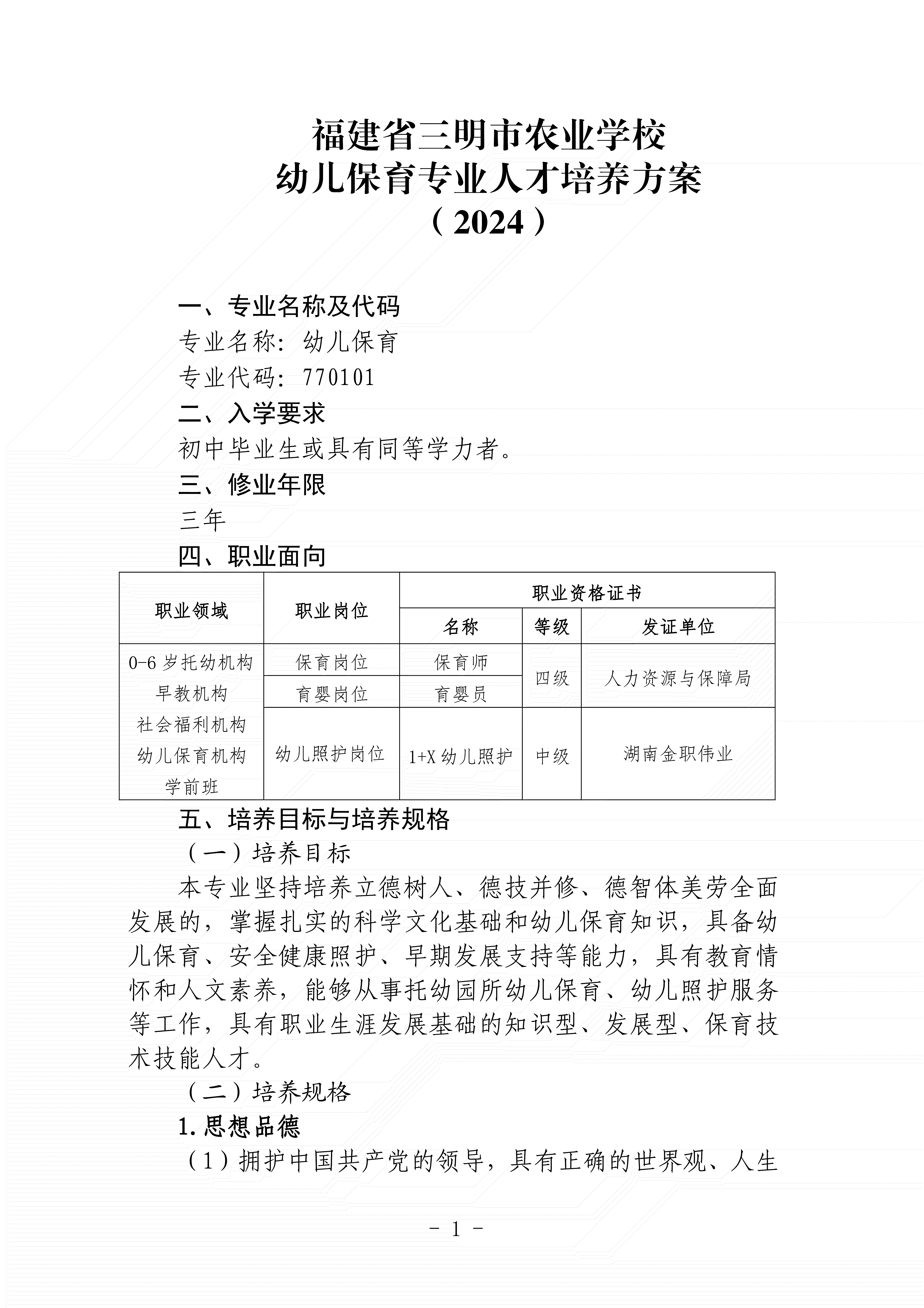 三明市农业学校幼儿保育专业人才培养方案(2024)