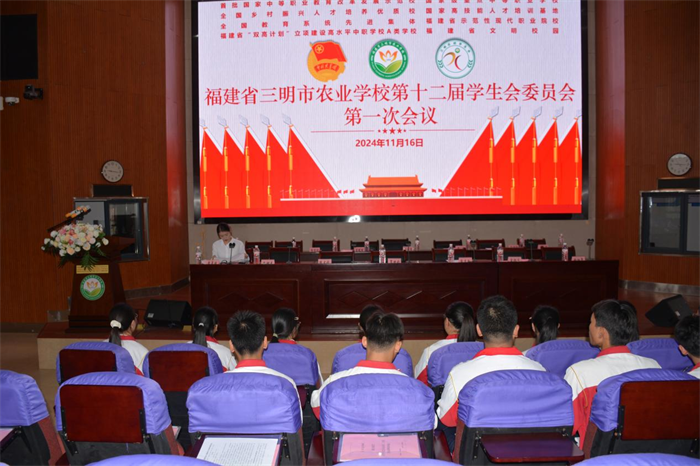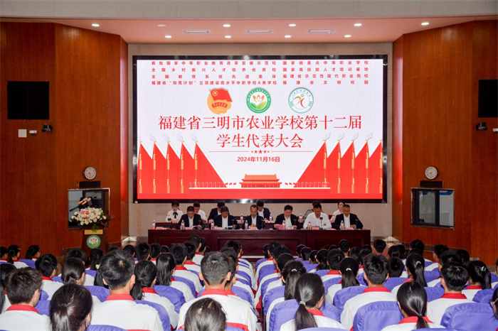 2024年11月16日,三明市农业学校第十二届学生代表大会在报告厅召开。三明市农业学校党委书记、校长罗世钦,共青团沙县区委书记张龙韬及学校党政领导出席会议,校团委各委员、全校156名学代会代表参加会议,大会由校团委书记官炳火主持。