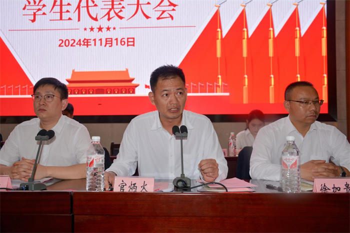 校党委书记、校长罗世钦向大会的成功召开表示热烈祝贺。罗校长在讲话中表示,近年来,学生会在学校党委的正确领导下,紧紧围绕学校党政中心工作,认真学习贯彻党的二十大精神和二十届三中全会精神,持续聚焦政治引领,立足同学切实需求,充分发挥引领青年、凝聚青年、服务青年的作用,在思想引领、校园文化、志愿服务、学生会社团改革方面拓展新思路、取得新进展、焕发新活力,为学校育人工作做出了重要贡献。他要求全体学生代表要牢记习近平总书记对青年的殷切嘱托,始终坚持党的领导,以更加饱满的热情、更加坚定的信念、更加扎实的作风,坚守理想信念,做新时代的追梦人,走在时代前列,做新征程的奋斗者,牢记服务宗旨,做新篇章的领头雁,共同书写学校创新发展新篇章,为实现中华民族伟大复兴的中国梦贡献青春力量!